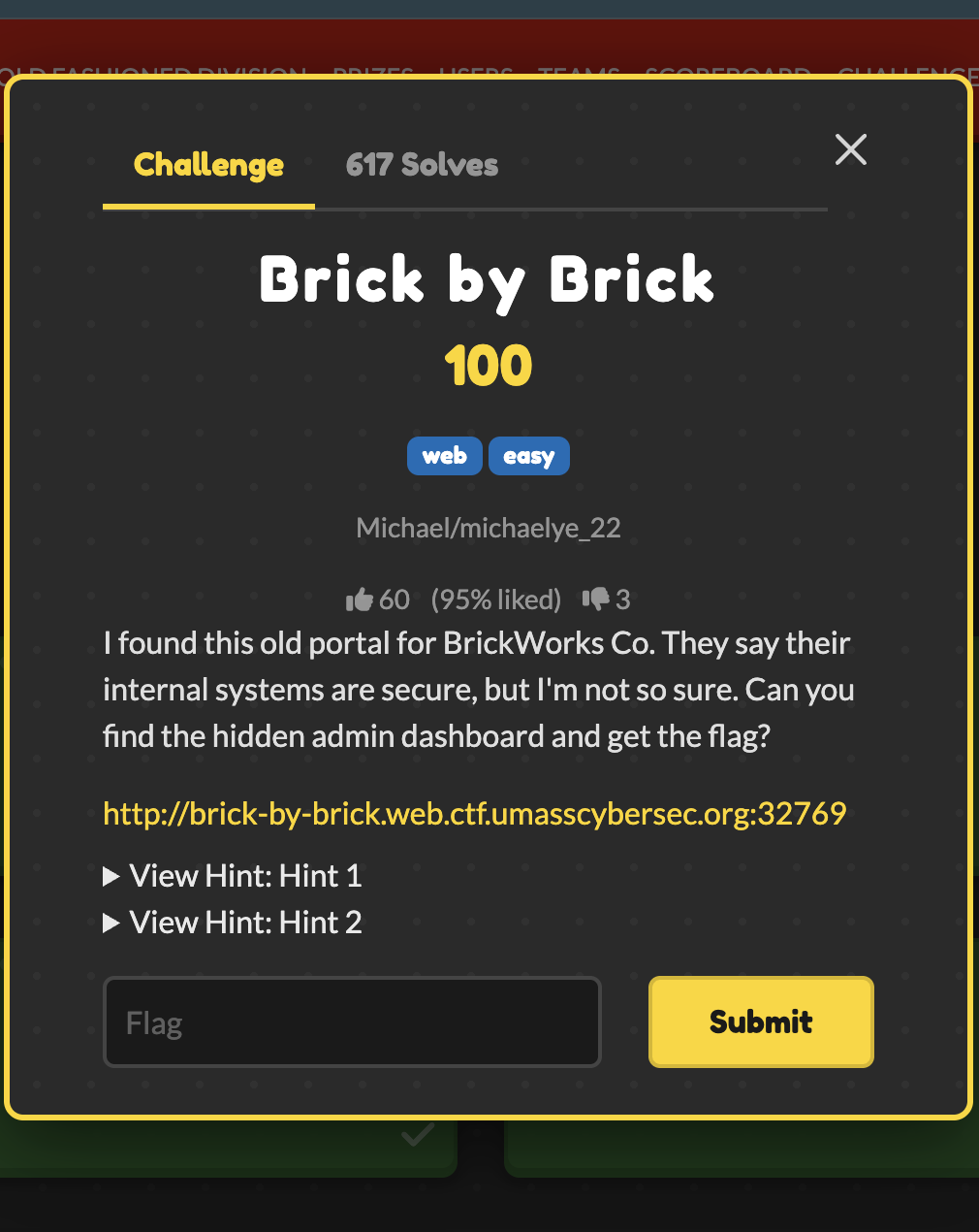 We can get access to file through the ?file= query parameter and the credentials is stored in config.php. Access http://brick-by-brick.web.ctf.umasscybersec.org:32769/?file=config.php: